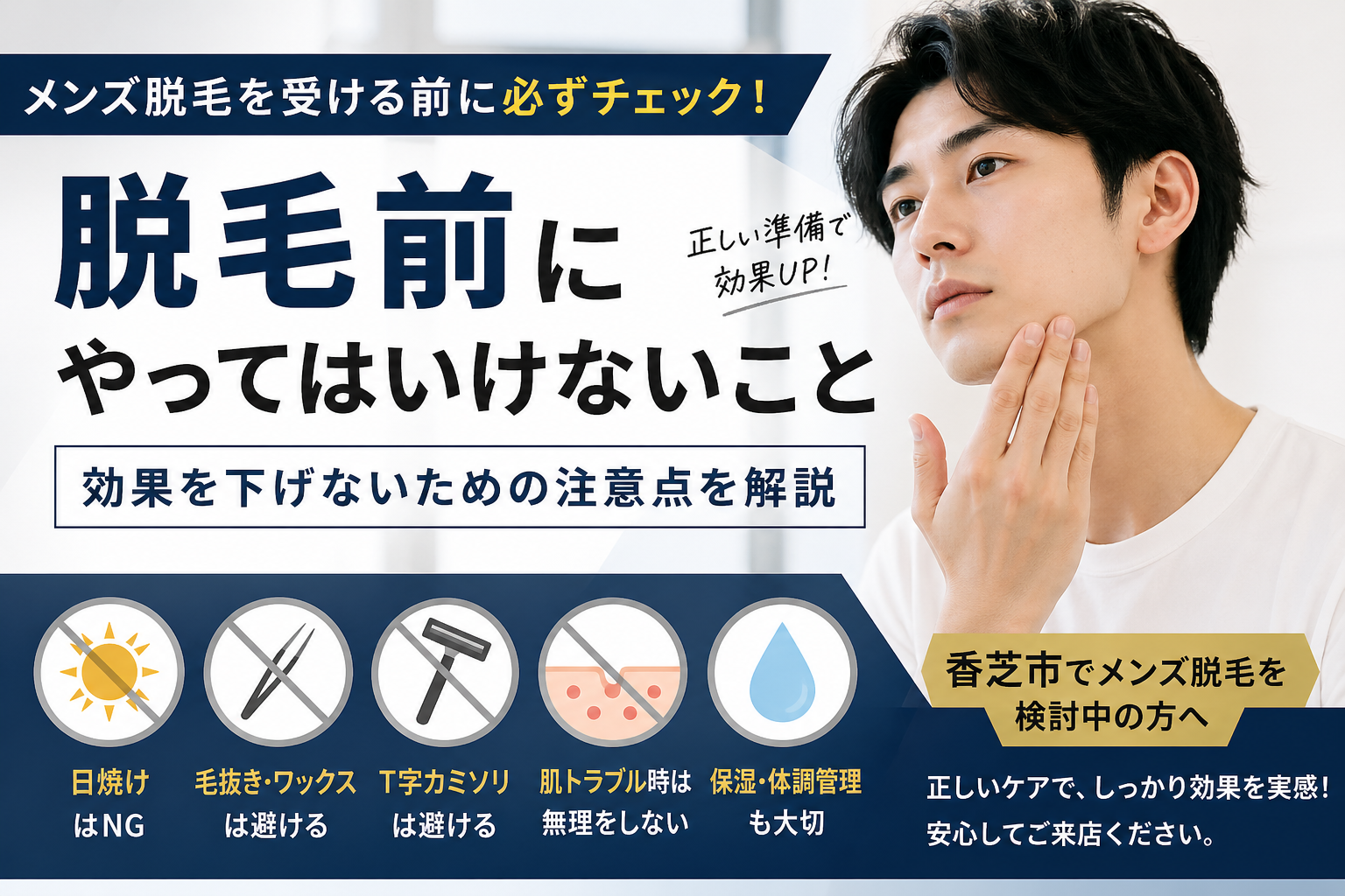 今回は、香芝市でメンズ脱毛を検討されている方に向けて、施術前にやってはいけないことと注意点を分かりやすく解説します。